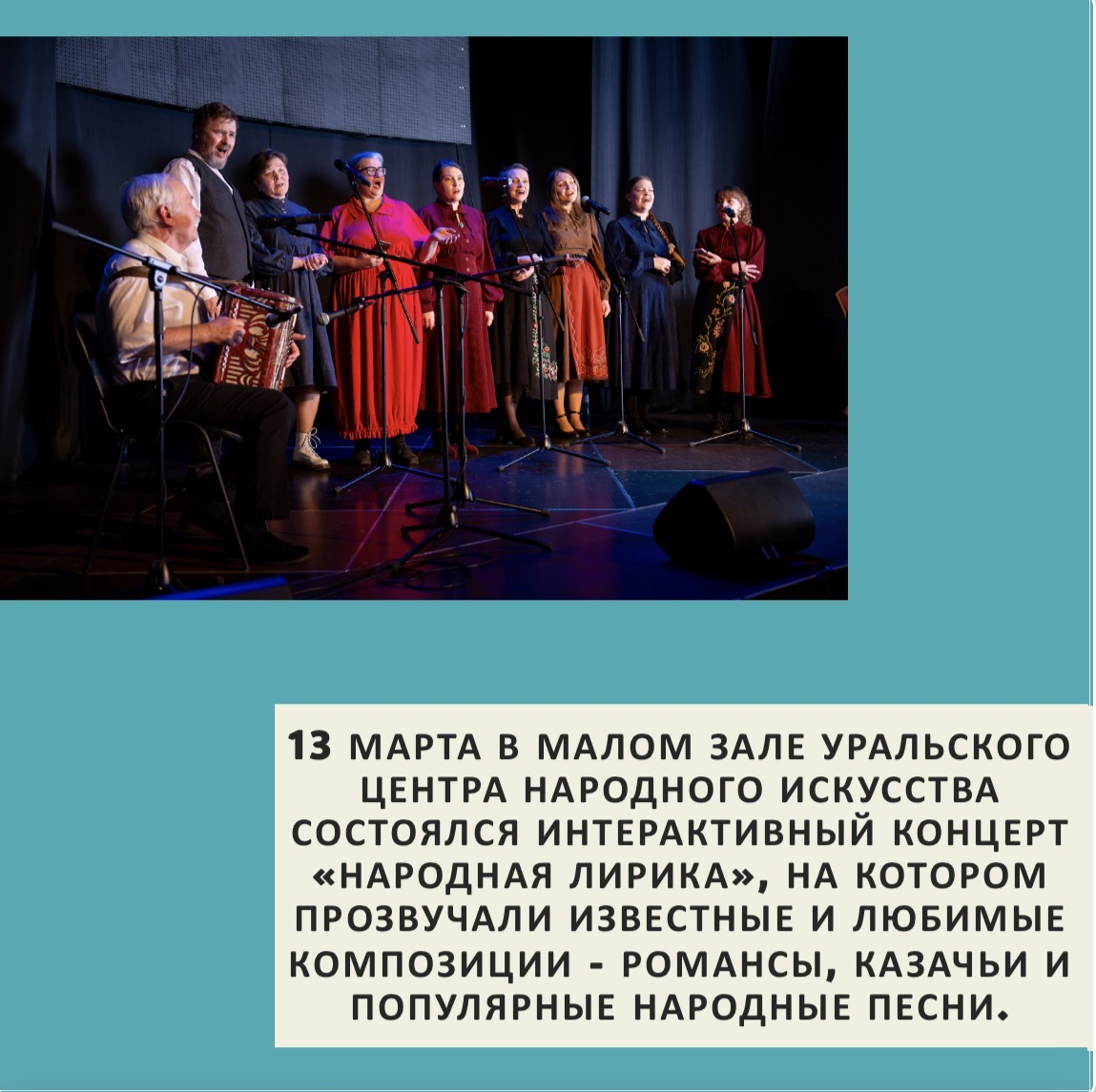13 марта в малом зале Уральского центра народного искусства состоялся интерактивный концерт «Народная лирика», на котором прозвучали известные и любимые композиции - романсы, казачьи и популярные народные песни.