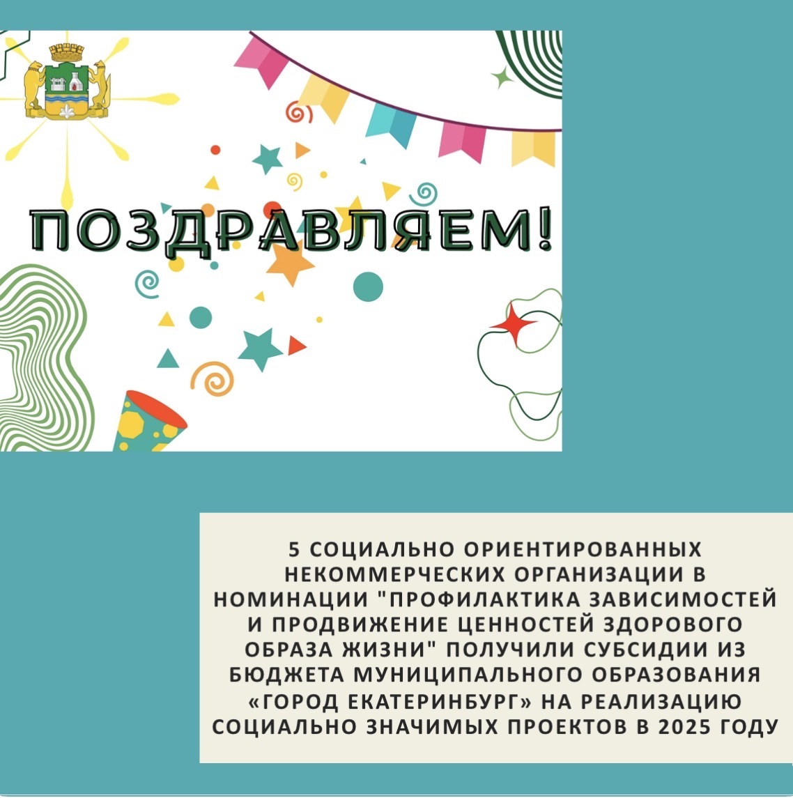 5 социально ориентированных некоммерческих организации в номинации "Профилактика зависимостей и продвижение ценностей здорового образа жизни" получили субсидии из бюджета муниципального образования «город Екатеринбург» на реализацию социально значимых проектов в 2025 году