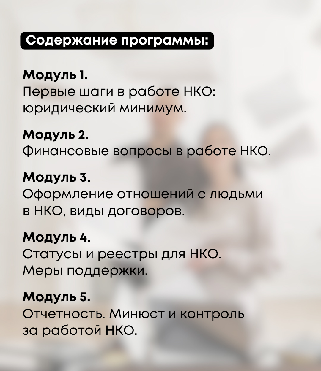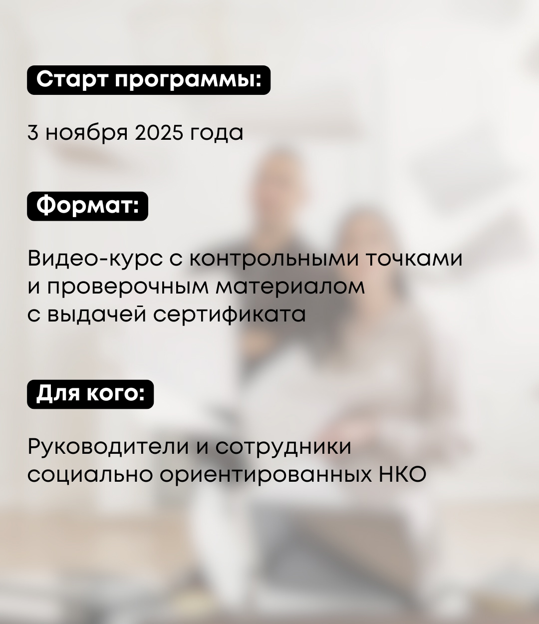 Это базовый курс про ключевые вопросы, которые возникают в работе новых НКО - от первых шагов после регистрации до работы с финансами и отчетностью. Акцент программы - опора на законодательство, управление рисками в условиях развития организации.