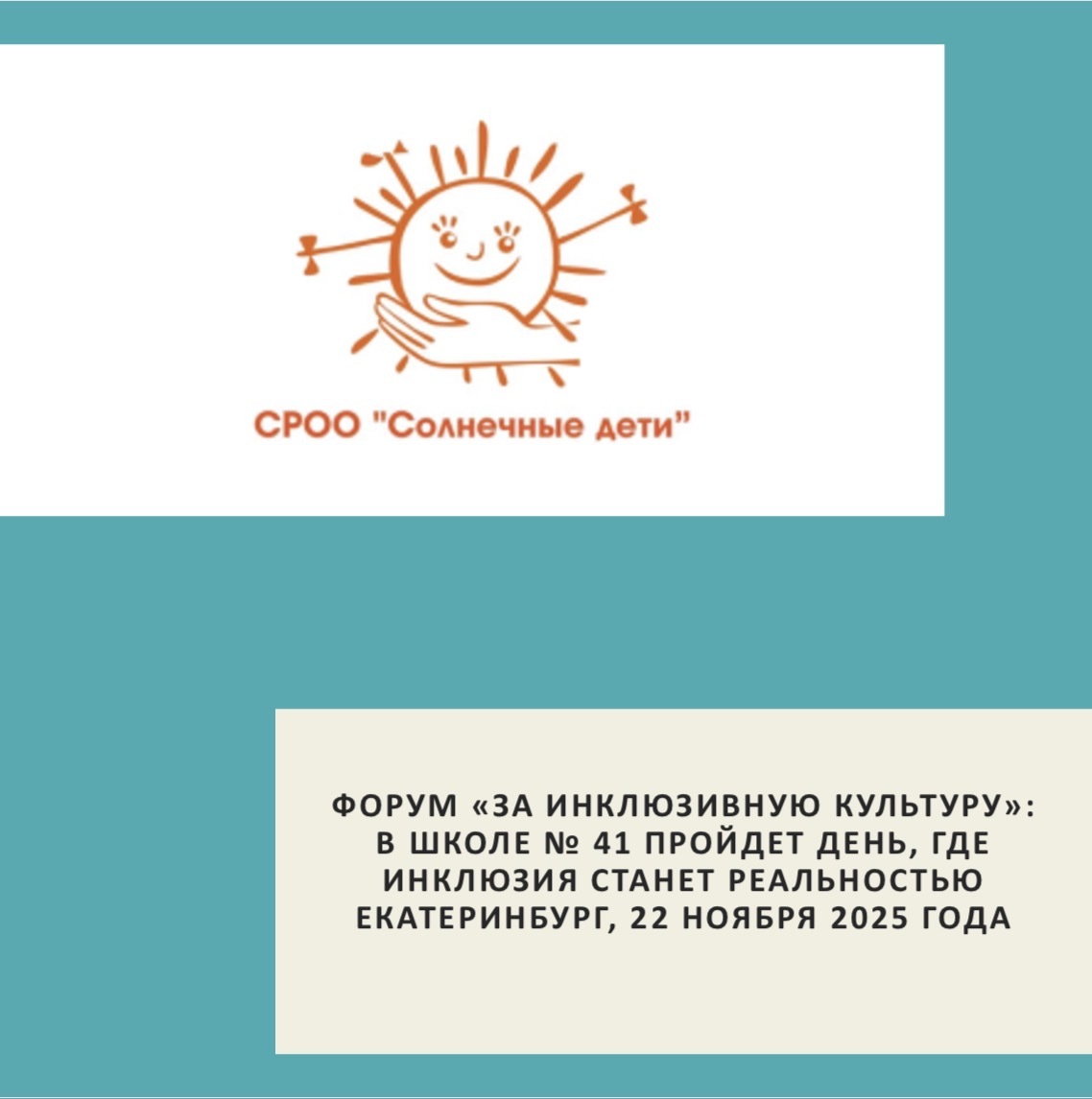 22 ноября в школе № 41 Екатеринбурга состоится форум «За инклюзивную культуру», организованный СРОО «Солнечные дети». В этот день обычная школа превратится в пространство, где дети с ментальными особенностями, их родители, специалисты и представители власти обсудят актуальные вопросы инклюзии и примут участие в практических активностях.