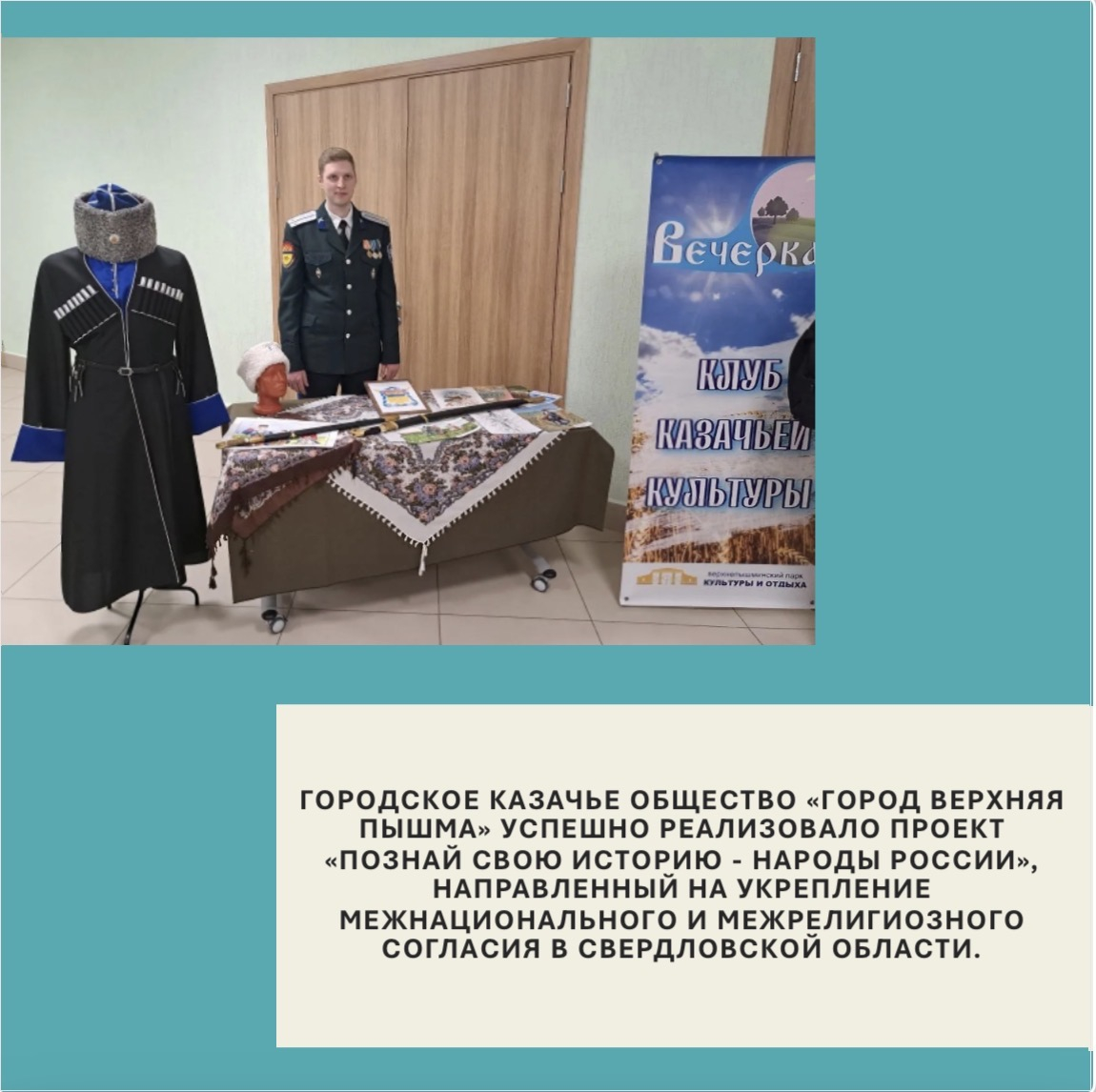 Городское казачье общество «Город Верхняя Пышма» успешно реализовало проект «Познай свою историю - народы России», направленный на укрепление межнационального и межрелигиозного согласия в Свердловской области.
