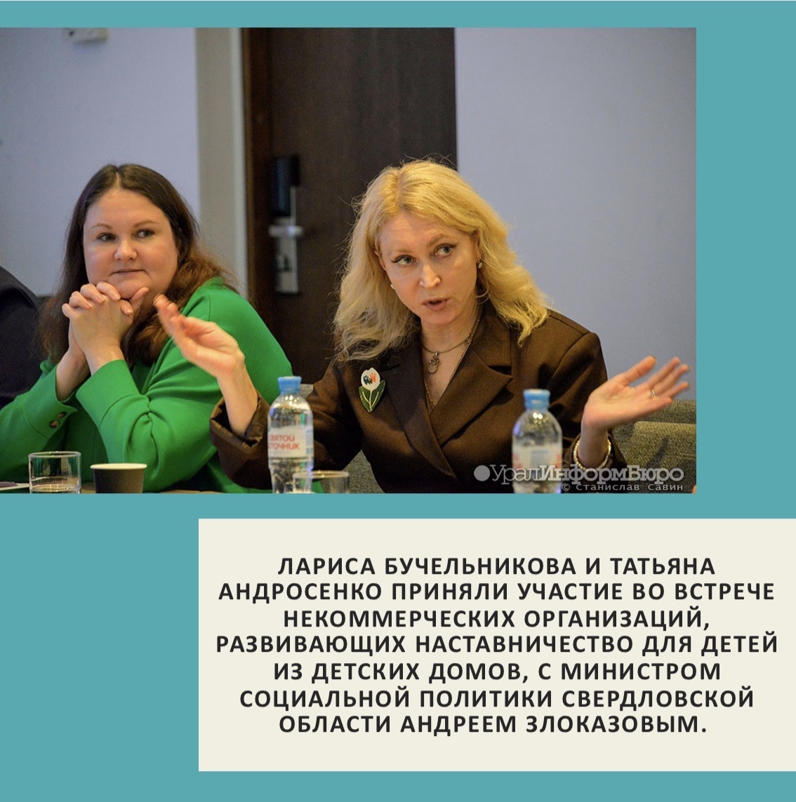 Лариса Бучельникова и Татьяна Андросенко приняли участие во встрече некоммерческих организаций, развивающих наставничество для детей из детских домов, с министром социальной политики Свердловской области Андреем Злоказовым. Встреча состоялась 31 октября на площадке отеля Cosmos.