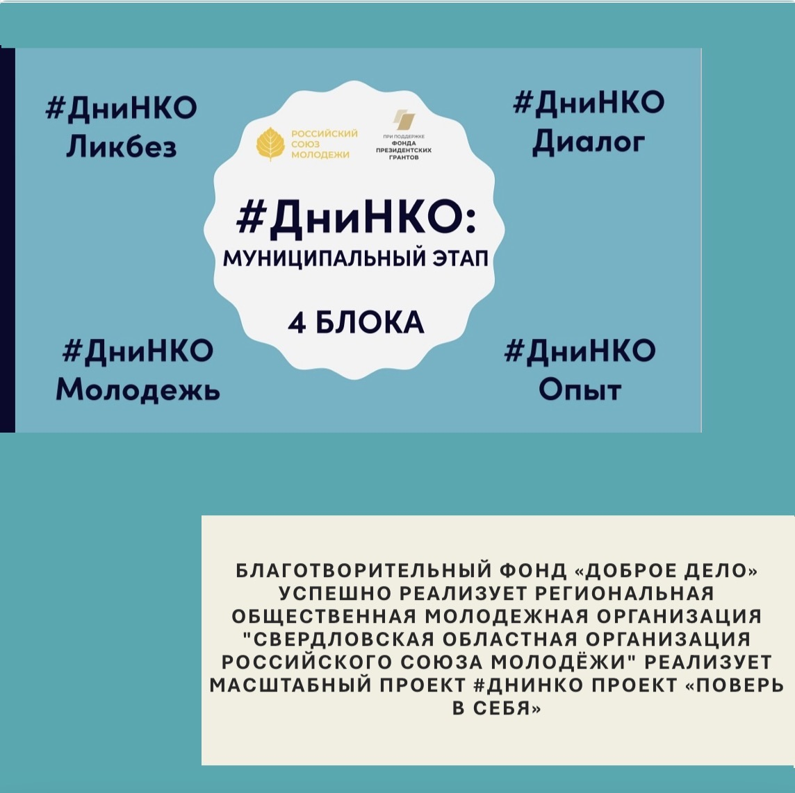 Свердловская организация Российского союза молодёжи реализует проект #ДниНКО, направленный на развитие гражданского общества. Проект поддержан Фондом президентских грантов и продлится с 2025 по 2026 год в 8 муниципалитетах области.