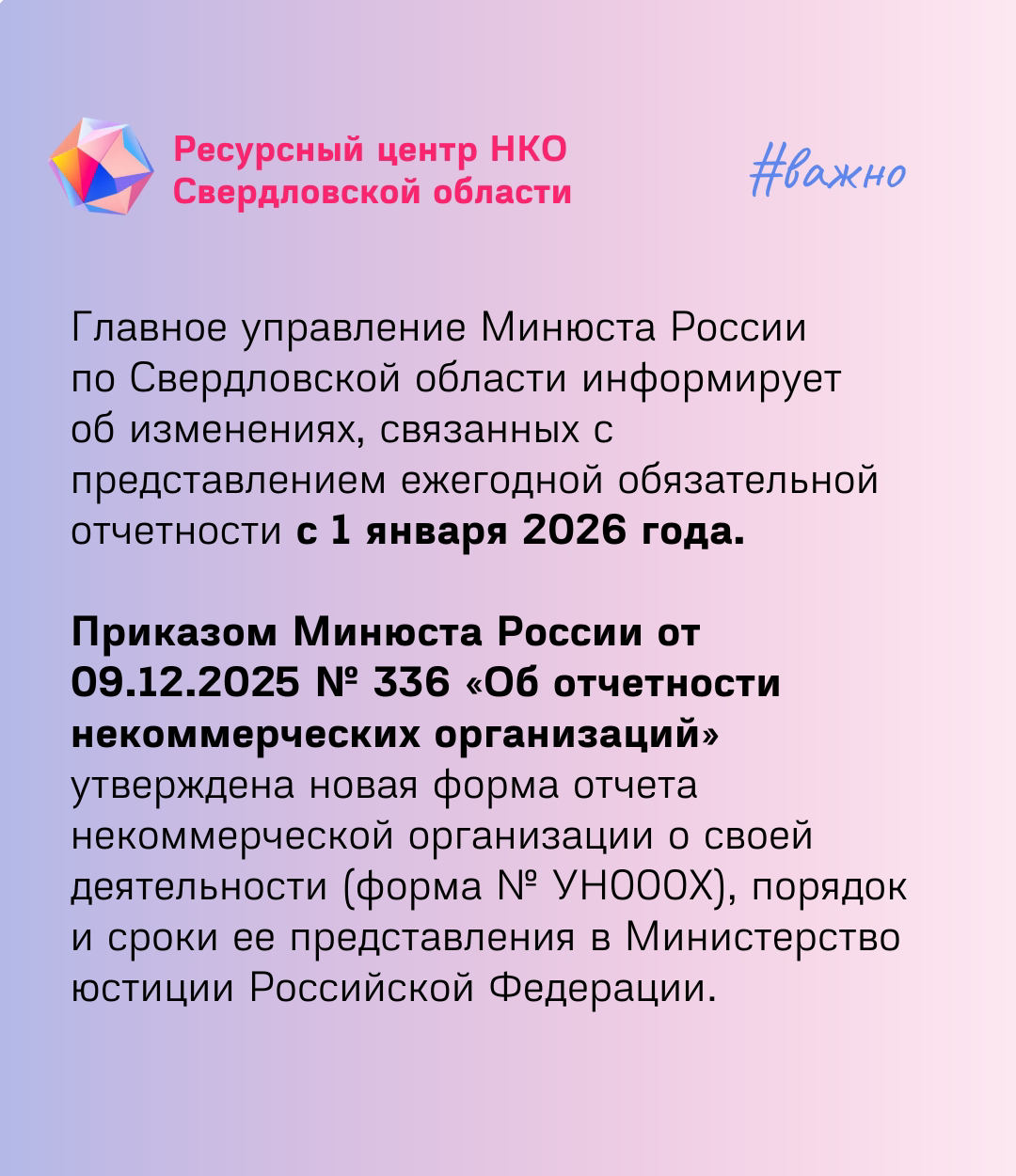 Опубликован Приказ Министерства юстиции России от 9 декабря 2025 года N 336 "Об отчетности некоммерческих организаций", который вступает в силу 1 января 2026 года.