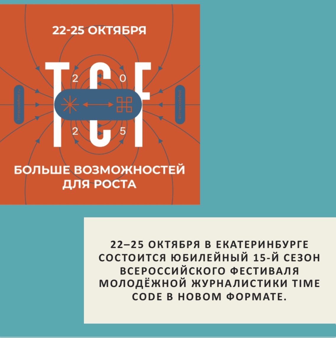 22–25 октября в Екатеринбурге состоится юбилейный 15-й сезон Всероссийского фестиваля молодёжной журналистики TIME CODE в новом формате.