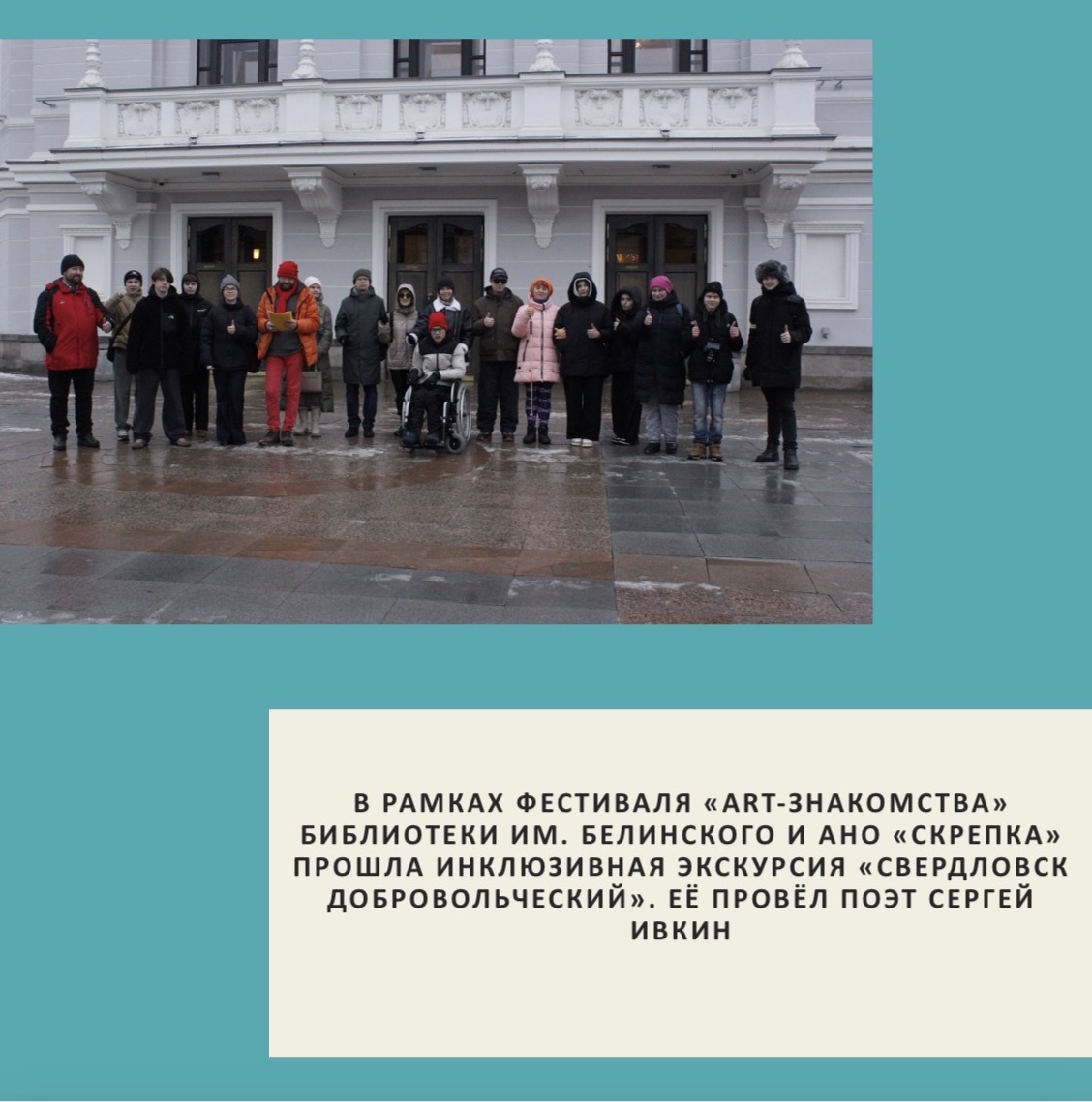 По приглашению Свердловского отделения РДФ в организации инклюзивной экскурсии приняли участие волонтерский отряд «Прорыв» 9Б класса МАОУ СОШ 81 (добровольческое объединение «Я ВОЛОНТЕР», руководитель Юлия Георгиевна Ставрова), медиацентр «Десятка» (ЕШИ-10) и медиаклуб «НЕОрайон» (Компрессорный район).