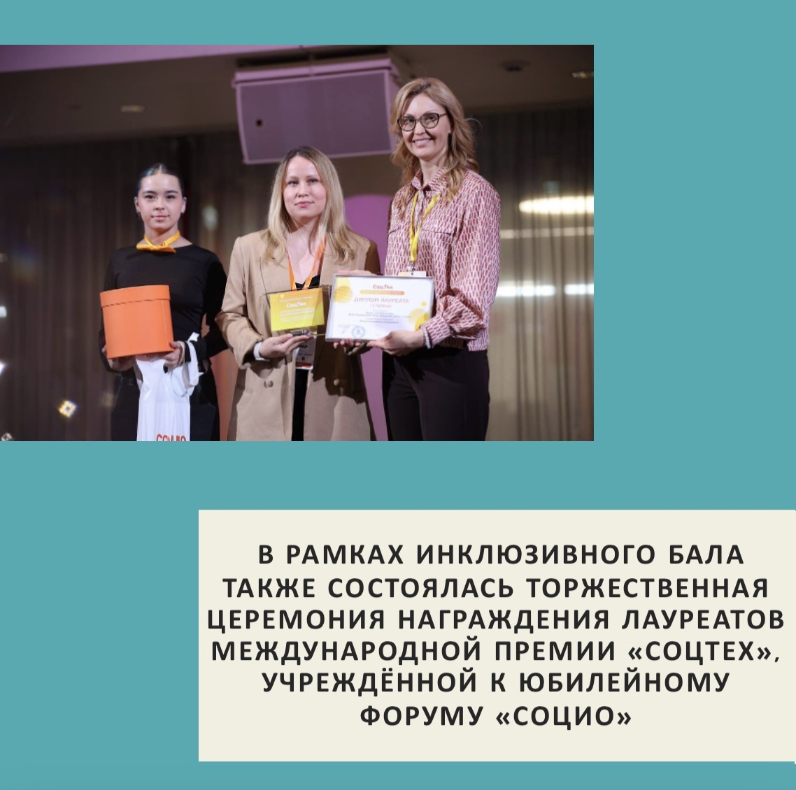 В рамках инклюзивного бала также состоялась торжественная церемония награждения лауреатов Международной премии «СоцТех», учреждённой к юбилейному форуму «СОЦИО». Премия направлена на выявление лучших технологий, сервисов и решений социальной направленности.