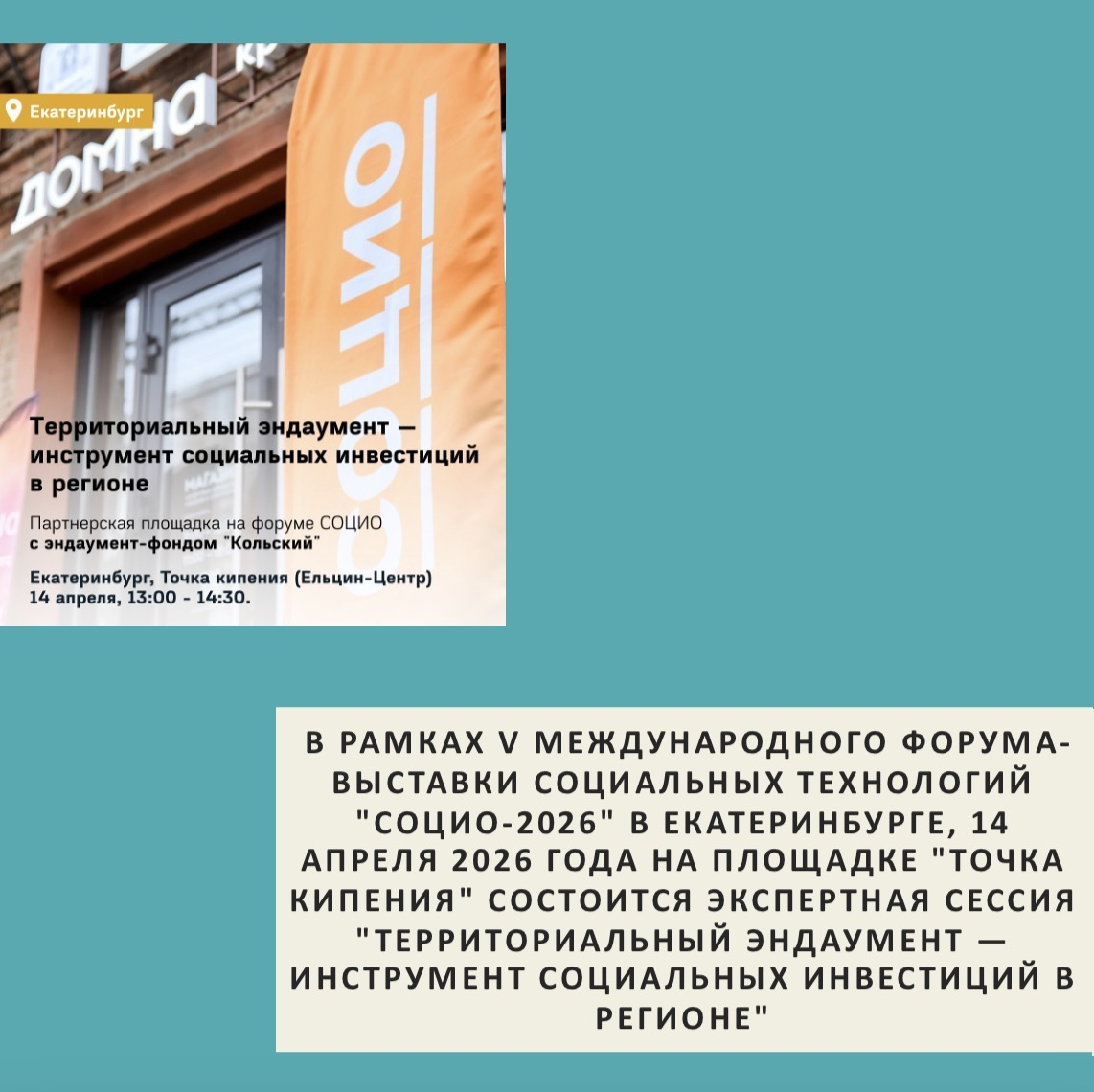 В рамках V Международного форума-выставки социальных технологий "СОЦИО-2026" в Екатеринбурге, 14 апреля 2026 года на площадке "Точка Кипения" состоится экспертная сессия "Территориальный эндаумент — инструмент социальных инвестиций в регионе", организуемая Эндаумент-фондом "Кольский" при поддержке Агентства стратегических инициатив и Корпорации развития Дальнего Востока и Арктики.